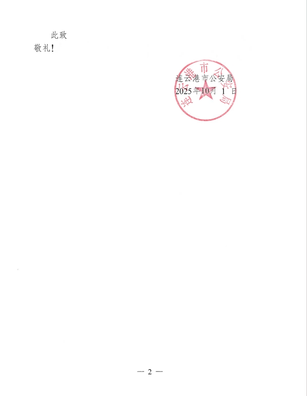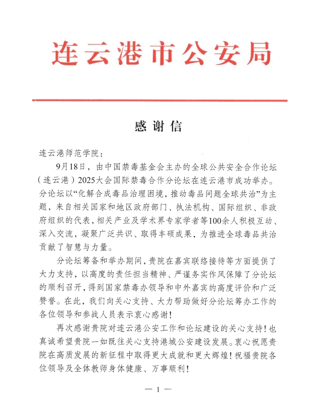 近日,连云港市公安局向我校发来感谢信,对我校在全球公共安全合作论坛(连云港)2025大会国际禁毒合作分论坛筹备与举办期间给予的大力支持致以诚挚谢意,特别肯定了我校志愿者团队在嘉宾联络接待等工作中发挥的积极作用与切实贡献。