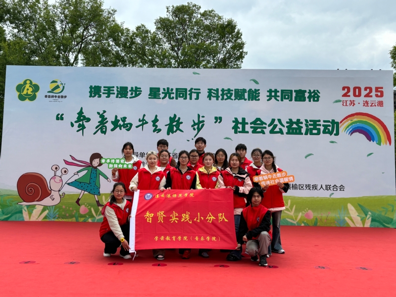 近日,学前教育学院(音乐学院)学生党支部组织智贤实践小分队的志愿者赴连云港市赣榆区生态公园,参与全省智力残疾人“牵着蜗牛去散步”大型社会公益活动。在省、市残联指导下,志愿者以“党建+公益服务”模式深度融入活动各环节,通过定向徒步、趣味运动与艺术互动,为200组心智障碍者家庭搭建融合实践平台,传递“慢节奏亦有光芒”的温暖力量。