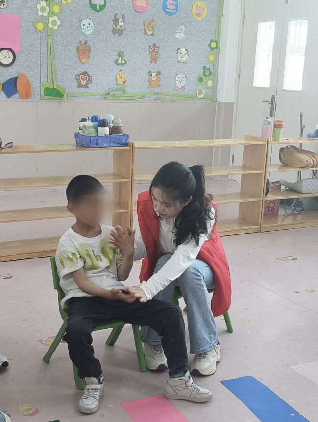 活动现场,馨康宝贝融合园的老师们进行动作训练的现场教学,将拍手、抬腿、跺脚等基础动作拆解为一个个清晰的示范步骤。老师们一边生动讲解,一边轻盈演示,每个动作都搭配充满童趣化的口令。志愿者们则分组来到孩子身边,采用“一对一陪伴+个性化引导”的模式协助教学。面对注意力容易分散的孩子,志愿者们拿出提前准备的卡通贴纸作为奖励,用一句句温柔的引导语,将孩子们的目光重新吸引回来;遇到动作协调性较弱的孩子,志愿者们便蹲下身来,通过肢体辅助帮助他们理解动作要领。“姐姐,我学会拍手啦!”当一名自闭症儿童在志愿者的鼓励下成功完成连贯动作时,活动室里响起了热烈的掌声。在持续90分钟的活动中,孩子们原本僵硬的小手逐渐变得灵活,能精准地拍打,原本踉跄的脚步也开始跟上音乐节奏。孩子们每完成一组动作,志愿者就会递上色彩斑斓地彩色画纸作为奖励,现场洋溢着“尝试—进步—鼓励”的良性互动氛围。“这些孩子需要的不仅是动作训练,更是持续的情感支持。”活动负责人介绍。此次志愿服务通过“动作训练 + 情感陪伴”双轨模式,既锻炼了特殊儿童的肢体协调性,又通过正向激励增强了他们的自信心。参与活动的志愿者感慨:“当看到孩子从躲闪眼神到主动击掌的转变,我真正理解了‘融合教育’的意义。”