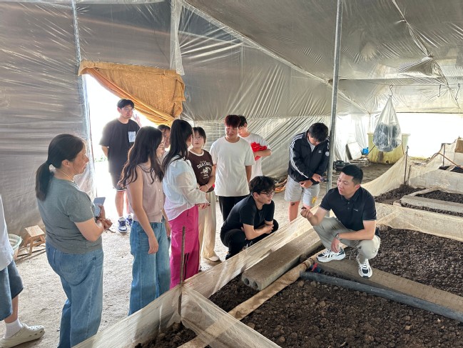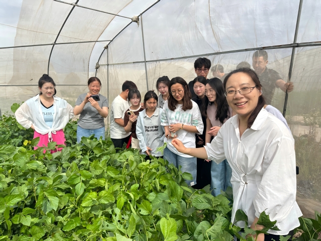 活动伊始,农场负责人以“豆虫成长记”开场,向师生们生动讲解了豆虫从卵到蛾子的四次变态发育过程。在豆虫养殖大棚,负责人手持绿叶上豆虫现场教学,激发了师生浓厚的的兴趣。大家兴致勃勃地穿梭在豆叶间,开启了一场别开生面的“寻虫之旅”。在灵芝养殖大棚,尚未成型的灵芝吸引了众人目光。负责人详细介绍:“灵芝孢子粉富含多种活性成分,是灵芝的精华所在,具有极高的药用价值。”在互动问答中,大家对灵芝有了更深入的认识。步入智能化管理的无土栽培番茄基地,宛如进入一座“空中菜园”,郁郁葱葱的番茄藤蔓沿着立体栽培架整齐攀爬,一串串色彩斑斓、形似灯笼的小番茄挂满绿枝。师生们品尝新鲜采摘的番茄,纷纷赞叹:“比超市的更新鲜、清甜,口感太好了!”负责人特别介绍了棚顶悬挂的鼓风式授粉设备,这一科技应用场景引得大家纷纷举起手机记录,直观感受科技赋能现代农业的魅力。团队还参观了蝴蝶兰智能化温室,一棵棵幼苗在恒温恒湿环境中生机盎然。在啤酒花种植区,负责人拨开淡绿色花穗讲解:“这是精酿啤酒的灵魂——啤酒花,我们种植的四个品种各具风味,其绿色树脂赋予啤酒独特苦味,生态种植保证原料零农药残留。”师生们凑近细闻,对“天然防腐剂”带来的独特啤酒香有了真切体验。