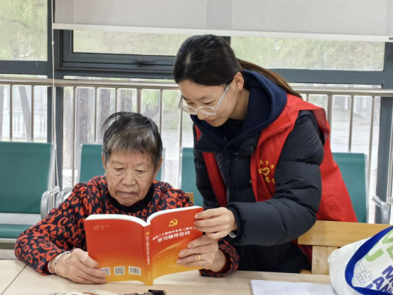 活动现场,志愿者们先为福利中心的老人们集中讲解了《党的二十届四中全会〈建议〉学习辅导百问》中的部分内容,将其中“完善养老服务体系”“推进基本公共服务均等化”等政策要点,转化为贴近生活的通俗表述,辅以图文标注,让老人们在轻松的学习中理解国家政策导向。在共读交流环节,志愿者与老人们结对伴学,共同阅读学习资料,展开互动讨论。针对部分老人视力不佳的情况,志愿者逐字逐句朗读“如何理解发展医育、医养结合服务”“如何理解扩大康复护理、安宁疗护服务供给”等相关段落。